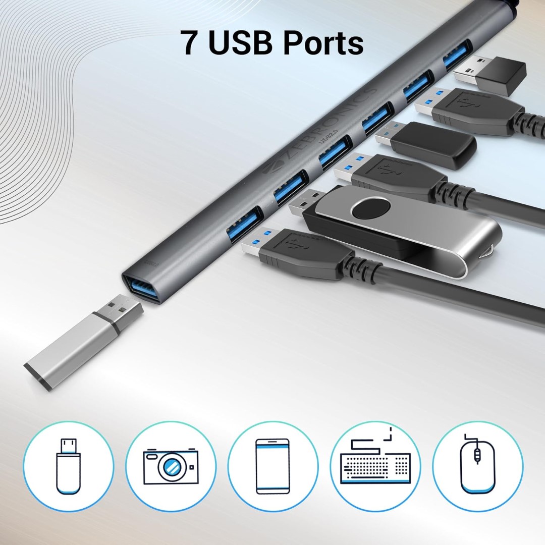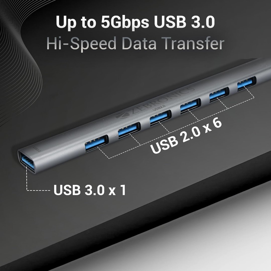 The ZEB-700HB by Zebronics is a stylish and functional multiport adapter designed to enhance your workspace with its sleek aluminum body that resists wear and tear. This versatile device features a total of seven USB ports, including one USB 3.0 port for high-speed data transfers of up to 5Gbps, alongside six USB 2.0 ports that accommodate a variety of peripherals and accessories. Its innovative 2-in-1 connector supports both standard USB and Type-C connections, allowing compatibility with a range of devices such as desktops, laptops, smartphones, and tablets, all while enabling simultaneous usage of multiple devices for maximum convenience.